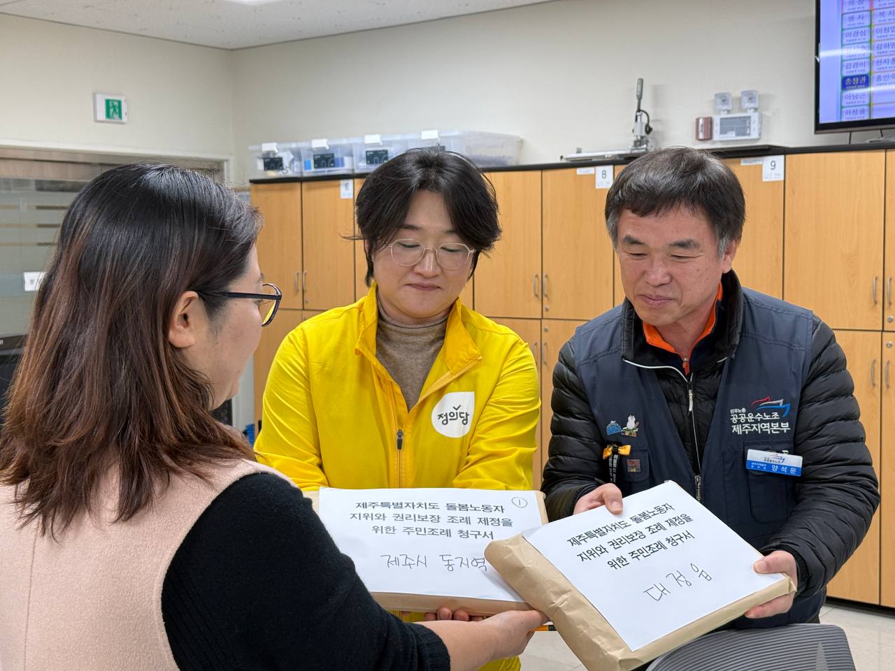 본부와 제주도당은 지난해 8월부터 6개월간 주민조례안을 청구하기 위해 서명운동을 했다. 이날까지 1천772명이 참여해 주민조례 청구를 위한 필요 요건인 1천30명을 훌쩍 넘겼다. 제주지역본부 관계자는 “본부 조합원과 당원 중 돌봄노동자가 있어 조례 필요성이 내부에서 제기돼왔다”며 “다른 지역에서도 돌봄노동자 관련 조례가 제정된 사례들을 참고해 주민조례청구를 추진하게 됐다”고 밝혔다.
