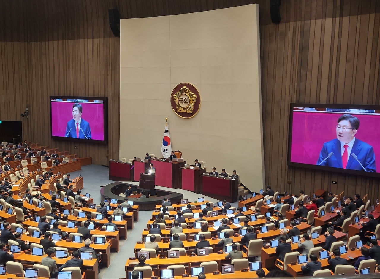 이날 약 40분간의 권 대표 연설이 끝나자 국민의힘 소속 의원들은 기립해 박수를 보냈다. 연설 과정에서 “적당히 해라” “(야당 비판 말고) 비전을 좀 이야기하라”고 항의했던 야당 의원들은 바로 자리를 떠났다.