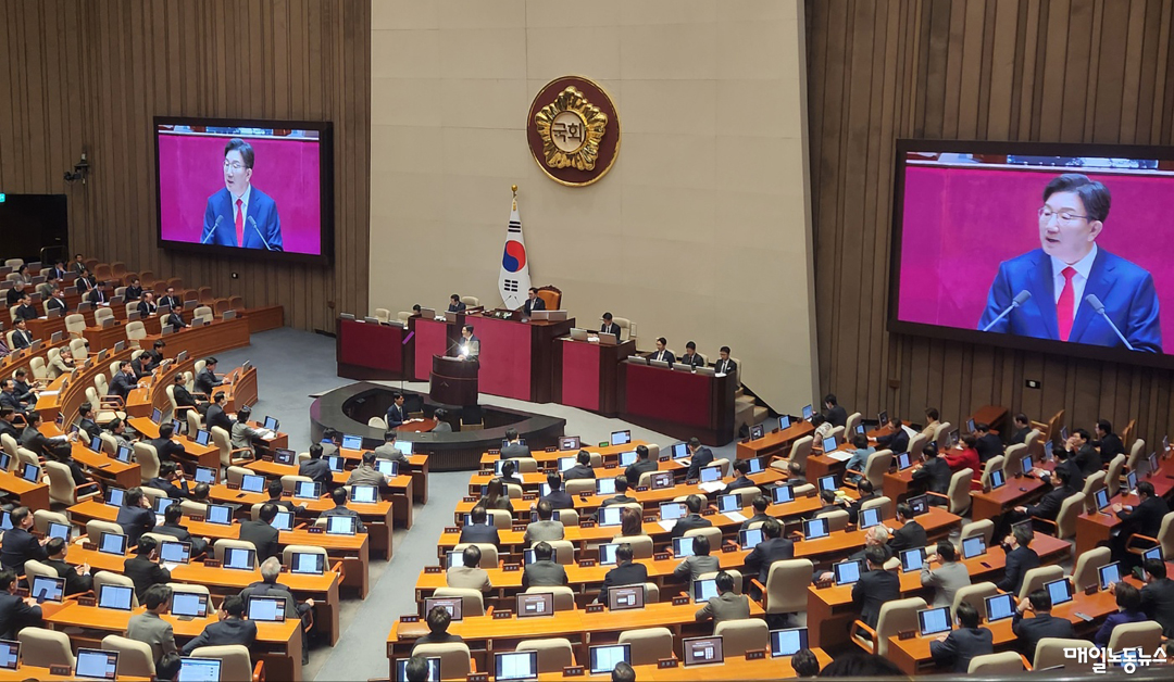 문재인 정부 비난도 빠지지 않았다. 권 원내대표는 지난해 경제성장률 2%, 건전재정 추진, 한미일 3각 협력 강화 등을 윤석열 정부의 성과로 들며 “문재인 정부 시기 국가부채는 400조원 이상 급증했는데, 악조건 속에서도 정부는 민생을 지원하며 건전재정을 추진했다”며 “문재인 정부에서 크게 흔들렸던 한미동맹은 역대 최고 수준으로 완전히 복원됐다”고 평가했다.
