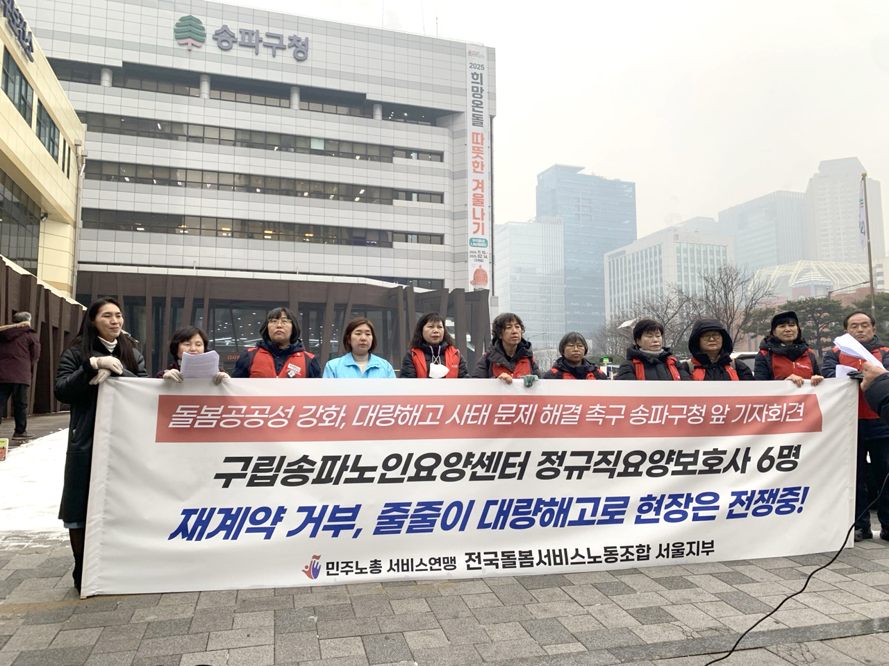 돌봄서비스노조는 12일 오후 서울 송파구청 앞에서 ‘구립송파노인요양센터 대량해고사태 문제 해결 촉구’ 기자회견을 열었다. 송파노인요양센터는 송파구가 설립한 공공요양시설로 사회복지법인 대한불교조계종이 위탁운영하고 있다.