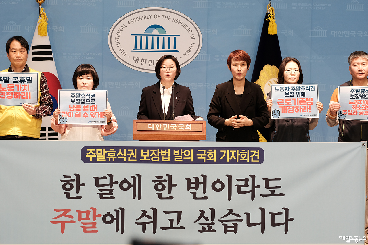 정혜경 진보당 의원은 서비스연맹과 함께 13일 오전 국회 소통관에서 기자회견을 열고 일요일을 유급휴일에 포함하고 월 1회 이상 토·일 연속 휴일을 보장하는 내용을 뼈대로 한 근로기준법 개정안을 발의했다고 밝혔다. 모든 노동자의 보편적 권리인 주말 휴식을 보장하기 위해 근로기준법상 노동자의 휴일 조건과 권한을 구체화하는 취지다.