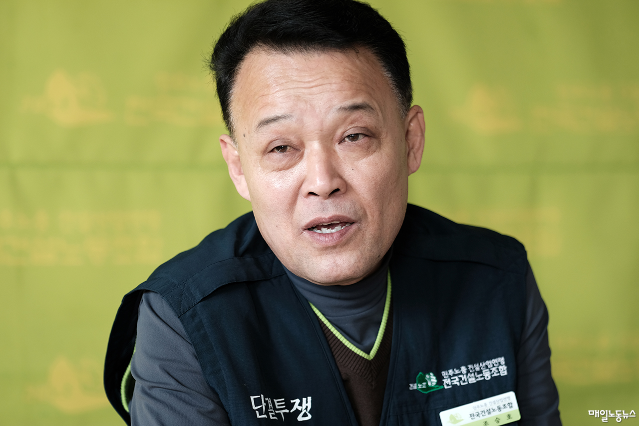 정권 내내 건설노조 때리기에 여념이 없었던 윤석열 대통령은 내란 우두머리 혐의로 서울구치소에 수감 중이지만, 떠난 조합원은 아직 노조로 돌아오지 못했다. 제대로 된 경제정책을 내놓지 못해 건설산업이 엉망이 되면서 실직이 늘었기 때문이다. 윤 대통령은 잡혀갔지만 여전히 건설기업은 노조 조합원 채용을 노골적으로 꺼린다. 지난달 임기를 시작한 건설노조의 조승호(59·<사진>) 노조 위원장과 강한수(49·사진 사무처장의 첫 번째 목표가 조직 정상화인 까닭이다. <매일노동뉴스>는 지난 14일 오후 서울 영등포구 노조 사무실에서 이들을 만나 당면 과제와 향후 노조의 대응을 들었다.