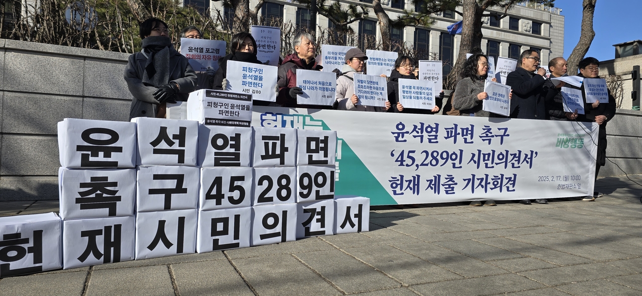 참여연대도 이날 오전 같은 장소에서 기자회견을 열고 윤 대통령 탄핵심판에 관한 의견서를 제출했다. 의견서에서는 12·3 비상계엄 선포행위의 헌법·법률 위반, 비상계엄 선포행위가 통치행위라는 주장 반박, 계엄포고령의 위헌·위법성 제시, 비상계엄 선포 전후 위헌·위법 행위 등 윤 대통령 파면 사유 5가지를 적시하면서 “헌법파괴 내란수괴 윤석열을 파면하라”고 목소리를 높였다.