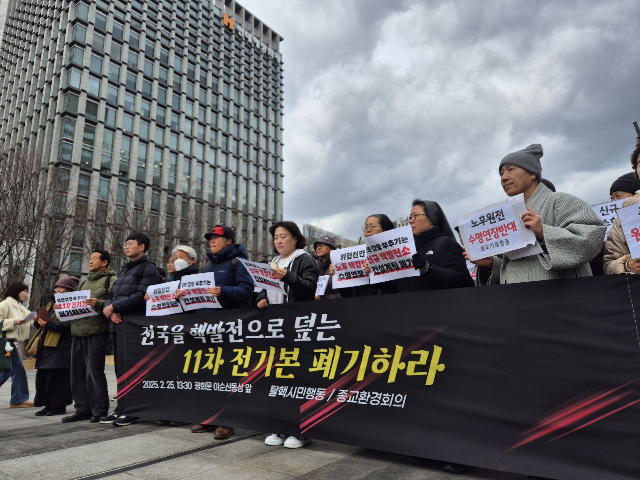 종교환경회의와 탈핵시민행동은 25일 오후 서울 종로구 이순신동상 앞에서 기자회견을 열고 “11차 전력계획은 노후 핵발전소 수명 연장과 신규 핵발전소 건설을 추진하고, 핵산업계만 반영하는 독소적 계획”이라며 “원자력발전 최강국을 표방한 윤석열 정부와 탈핵 가치를 버린 더불어민주당의 합작물”이라고 비판했다.