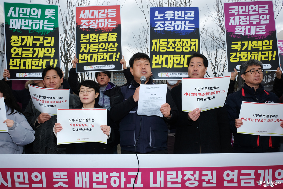양대 노총과 참여연대 등이 참여한 공적연금강화국민행동은 25일 오후 국회 앞에서 기자회견을 열고 “거대 양당의 동상이몽 속에 벌어진 연금개혁 졸속 합의 시도는 이들이 진정 민주주의를 존중하는지, 국민의 존엄한 노후를 위하는지 의심하게 만들었다”고 지적했다.