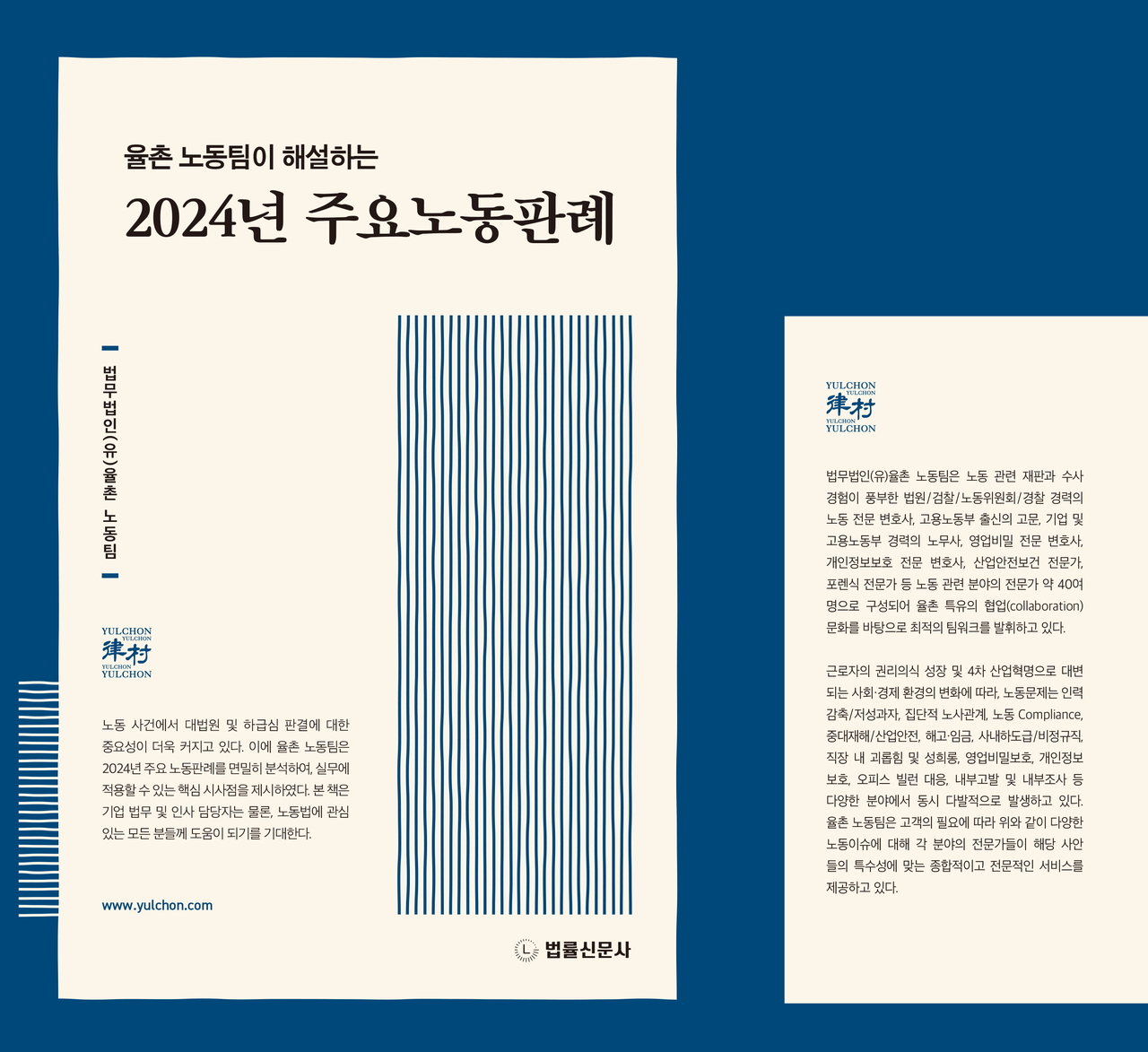 율촌 노동팀을 이끄는 조상욱 변호사는 “이번 2024년 노동판례집이 사내변호사와 인사 담당자 등에게 급증하고 있는 노동 분쟁에 대해 종합적 시각을 갖추는 데 도움이 되기를 기대한다”며 “율촌은 앞으로도 매년 노동판례집을 펴내 실무에 도움이 될 수 있도록 노력하겠다”고 밝혔다.