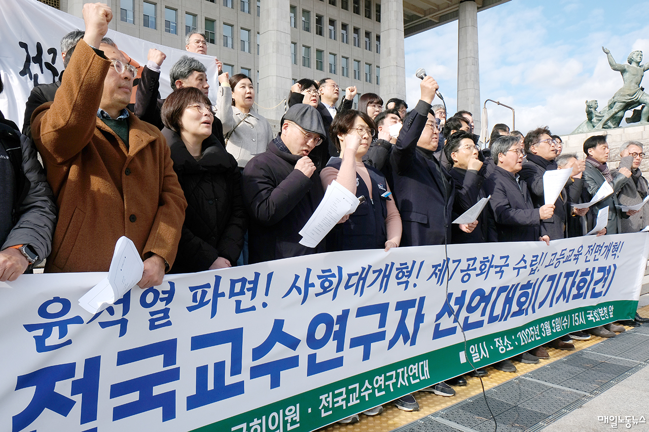 ‘윤석열 내란세력 완전청산과 제7공화국 수립을 위한 전국교수연구자연대’는 5일 오후 국회 본관 앞에서 기자회견을 열고 “윤석열을 파면하고 사회대개혁으로 7공화국 문을 힘차게 열어가자”고 밝혔다. 연대에는 교수노조·국공립대교수노조·비정규교수노조와 공공운수노조 대학원생노조지부 등 8개 고등교육단체가 참여했다.