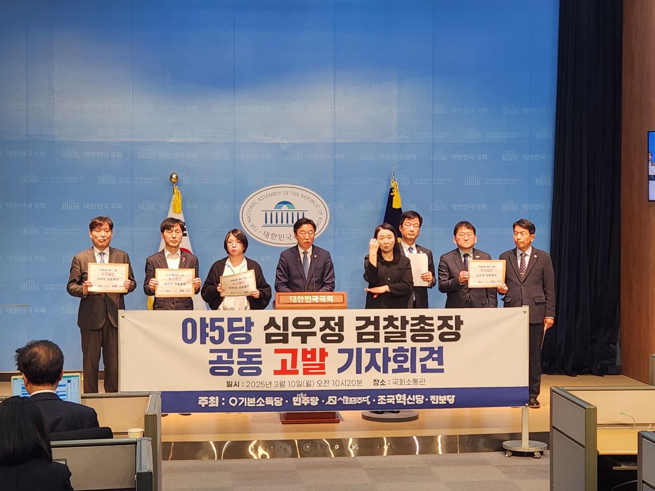 야당은 법원의 윤 대통령 구속취소 결정에 즉시항고를 포기한 심 검찰총장을 직권남용 혐의로 공수처에 고발하며 맞불을 놨다. 더불어민주당·조국혁신당·기본소득당·진보당·사회민주당은 이날 오전 국회 소통관에서 기자회견을 열고 “심 총장은 상급심에서 다퉈 볼 기회도, 여지도, 근거도 충분한 상황에서 너무나도 손쉽게 투항하며 즉시항고 포기를 결정했다”며 “내란수괴를 풀어 주기 위한 검찰의 큰 그림이 명확하다”고 주장했다. 야당은 기자회견 뒤 공수처에 고발장을 접수했다.