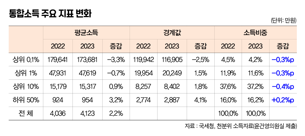 국세청이 더불어민주당 윤건영 의원실에 제출한 2023년 귀속본 근로소득·종합소득·통합소득 천분위 자료를 분석해본 결과, 고소득층이 전체 소득에서 차지하는 비중이 2022년에 이어 2023년에도 감소하는 등 개인분배지표가 개선된 것으로 나타났으나, 2024년부터 시작된 배당금 증가 현상과 감세 영향 등으로 앞으로는 추가 개선이 어려울 것으로 예상됐다.