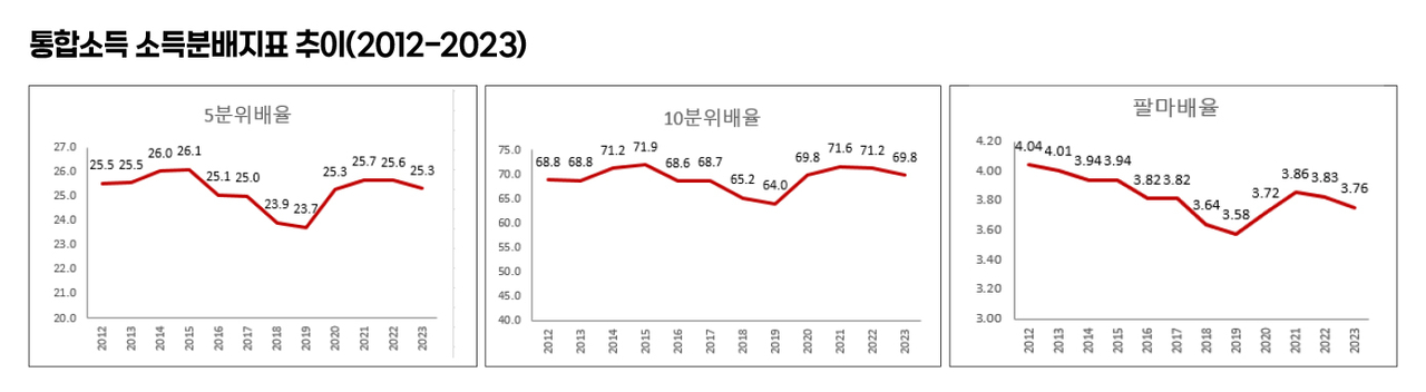 통합소득 5분위배율과 10분위배율은 각각 25.6배에서 25.3배로, 71.2배에서 69.8배로 격차가 줄었으며, 상위 10%와 하위 40%의 소득배율을 뜻하는 팔마배율도 8.76배에서 7.94배로 개선된 것으로 나타났다. 하지만 코로나19 사태가 발생했던 2020년 수준 정도이고 가장 양호한 소득분배 지표를 보였던 2018~2019년 시기 수준을 회복하는 정도에는 한참 못 미친다.
