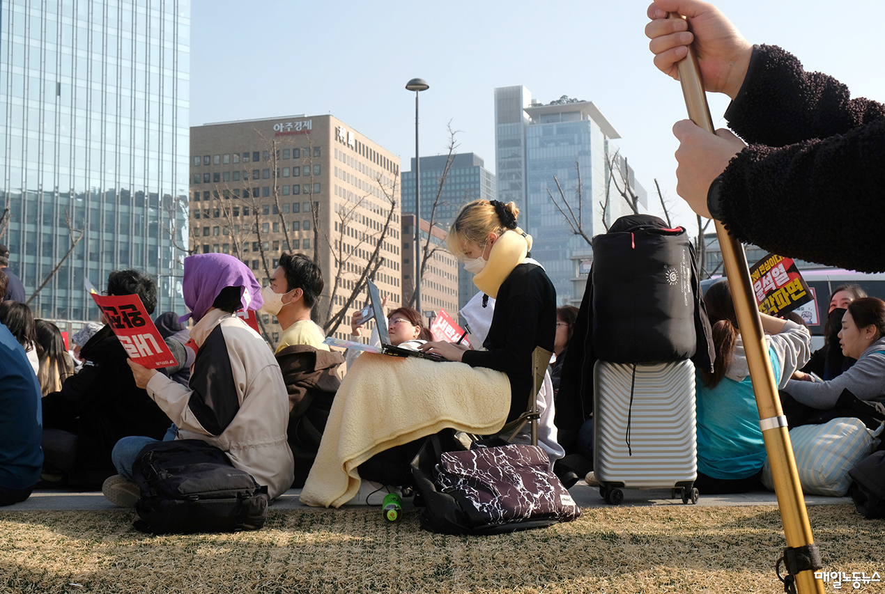아무 일도 일어나지 않았다고 내란수괴가 말했다. 아무도 일어나지 않고 시민들은 한겨울 찬 바닥에 앉아 은박지 덮어쓰고 버텼다. 혹독했던 그 추위도 순리 따라 물러가고 어느덧 봄볕에 바람 살랑 분다. 아무것도 바뀐 게 없어 시민들은 오늘 광장을 떠나지 못하고 목이 쉬어 간다. 공부를 놓을 수 없어, 밀린 일을 두고 볼 수도 없어, 저기 노트북 자판 치던 틈틈이 즉각 파면 구호를 외친다. 밤을 새울 짐을 꾸려, 저기 바퀴 달린 가방 끌고 나선 길이다. 불청객 황사를 피하려 마스크를 잊지 않았다. 지난 긴 여행길에 잘 썼던 목 베개 챙겨 긴 시간 집회를 대비했다. 노숙할 결심이다. 그곳 광장엔 사랑하는 이들을 지키고 싶다고, 두고 볼 수만은 없어 뭐라도 해야겠다고 나온 사람들이 봄볕 아래 새잎 올리는 잡초처럼 저마다 결연했다. 깃발 꼭 쥔 사람들이 그 사이사이 삐죽 높았다. 여러 가지 색 입은 깃발들이 돛처럼 부풀었다. 집어등 밝힌 큰 배처럼 도심 대로를 천천히 나아갔다. 여태 지치지 않은 사람들이 파면과 함께 봄을 맞겠다고 겨울 끝 광장에 무성하게 돋아났다.