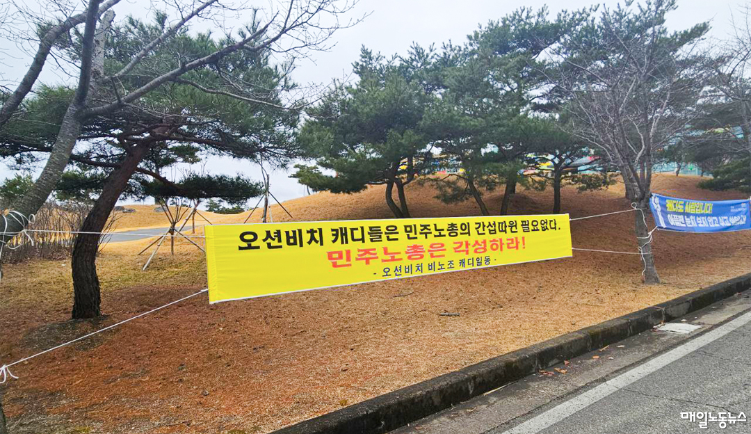 사용자쪽은 그때와 마찬가지로 농성 중인 조 분회장을 끊임없이 고립하려 하고 있다. 대표이사나 회장은 “민주노총은 빼고”라며 민주노총 탈퇴를 종용하거나 “노조 안 하면 받아 주겠다”는 발언도 서슴없었다. 조 분회장이 농성을 시작한 12월께에는 회사 안에 캐디자치회라는 단체가 설립됐다. 자치회는 조 분회장의 가입을 거절했고 사쪽과 사실상 교섭을 진행하기도 했다. 조 분회장은 지난달 대표이사와 사내이사(회장)를 부당노동행위로 포항지청에 고소한 상태다. 고소 이후 농성 중인 조 분회장에 대한 탄압은 더욱 심해져 충돌도 일상화됐다. 최근에는 골프장 안에 ‘비노조 캐디일동’이라는 이름으로 “오션비치 캐디들은 민주노총 간섭따윈 필요없다. 민주노총은 각성하라!”는 현수막이 붙기도 했다.