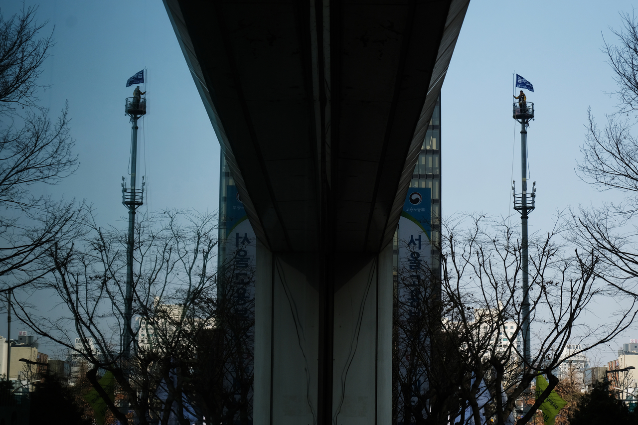 오르고 오른다. 붙잡을 것도 안 보여, 어찌 올랐는지를 아래 사람들은 모른다. 새들만 날아들 곳에 둥지 틀어, 겨우 서고 앉는다. 어찌 잠드는지도 알 길이 없다. 마음 저린 사람들이 그저 고개 들어 먹먹한 눈을 하고 바라보다 가끔 손 한번 흔들어 본다. 내란수괴 파면을 외치는 광장으로 향하는 행진이 매일 그곳에서 출발했다. 그 앞 노동청 유리창이 매끈해, 거울처럼 비쳤다. 겨울 다 가도록 내란은 끝나지 않았고, 계엄 즈음 시작한 그의 상경 싸움도 계속된다. 헌정을 지키려는 싸움, 그 거대한 물결에 덮일까, 필사적으로 삐죽 솟아오른 곳이 저기 철탑 위다. 굶고 기고, 천막 짓고 버틴 오랜 시간 동안 거칠어졌을 그 억척스러운 손으로 노조 깃발 붙들고 서 있다. 그 모습을 보고서야 하청노동자 척박한 노동 현실을 깨닫는다. 내란의 주범과 그 동조자들의 악다구니 저항을 본 뒤에야 우리 사회 취약한 헌정질서를 돌아본다. 거울이다. 그러니 봄바람 불어도 겨울이다. 거울은 먼저 웃지 않는다. 내려가는 법을 찾겠다고, 내란수괴 끌어내리는 길을 열겠다고, 그 아래에서 마음 아린 사람들이 매일같이 소리 높여 행진한다. 어두운 광장에 불 밝힌다. 새봄을 바란다.
