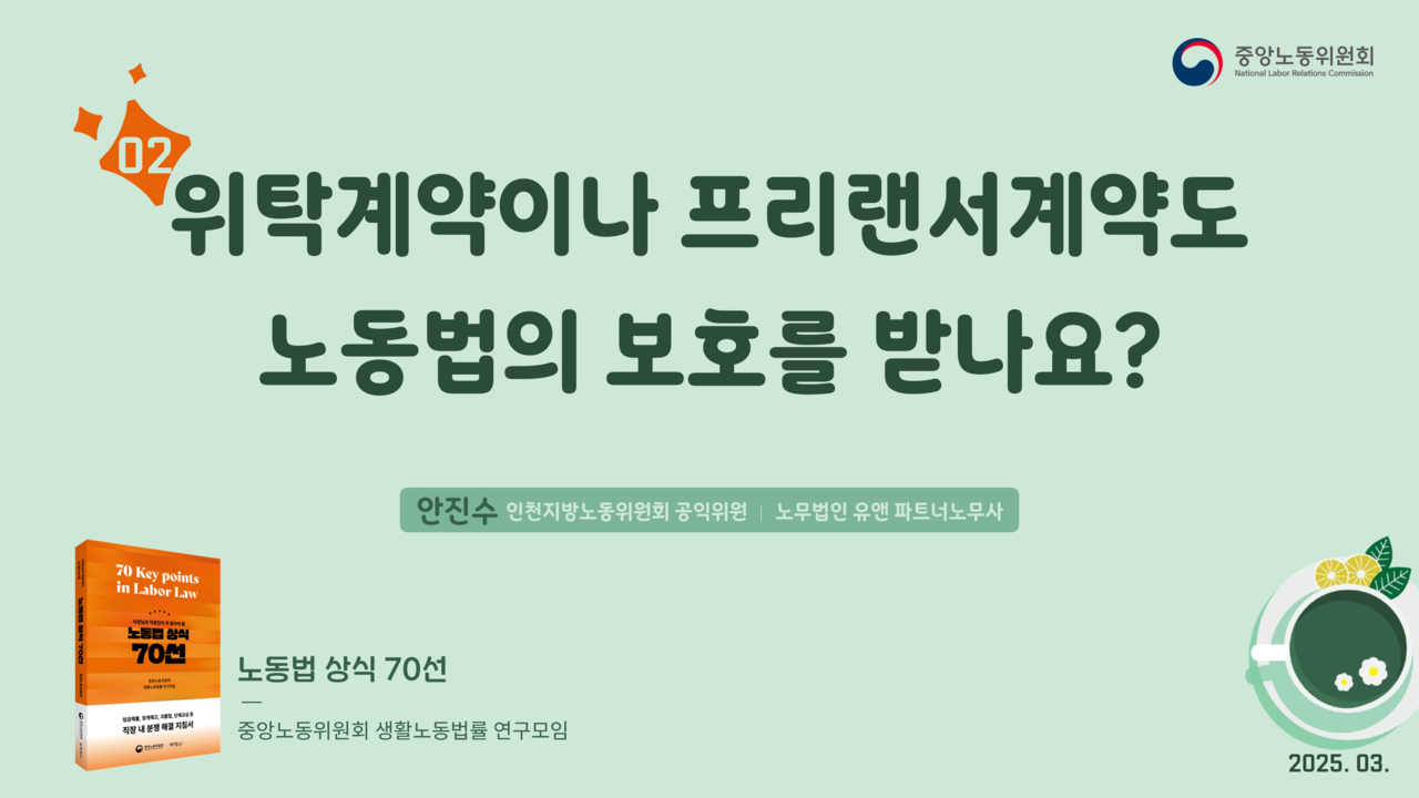 25일 중앙노동위원회 유튜브 채널에 공개된 ‘위탁계약이나 프리랜서 계약도 노동법의 보호를 받나요’ 영상 내용 중 일부다. 중노위는 지난해 발간한 책 ‘사장님과 직장인이 꼭 알아야 할 노동법 상식 70선’의 주요 내용을 동영상으로 시청할 수 있다고 밝혔다.