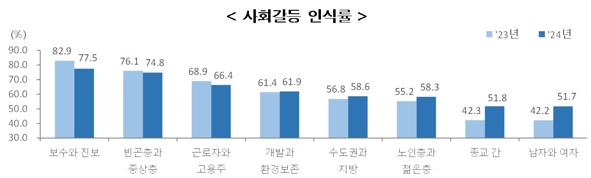 통계청이 25일 발표한 ‘2024 한국의 사회지표’에 따르면 지난해 사람들이 크게 느낀 사회갈등은 ‘보수와 진보’(77.5%)로 나타났다. 82.9%였던 전년과 비교하면 5.4%포인트 감소했다. 다만 이 조사는 지난해 8~9월 조사 시점 기준이라 12·3 비상계엄 이후 정치적 혼란 상황은 반영되지 않았다. 이어 ‘빈곤층과 중상층’(74.8%), ‘근로자와 고용주’(66.4%) 간 갈등이 뒤따랐다. 갈등 인식률이 가장 낮은 유형은 ‘남자와 여자’(51.7%)에 이어 ‘종교 간’(51.8%), ‘노인층과 젊은층’(58.3%) 순이었다. 이 중에서 ‘남자와 여자’ ‘종교 간’의 경우 전년대비 가장 큰 증가폭(9.5%포인트)을 보였다.
