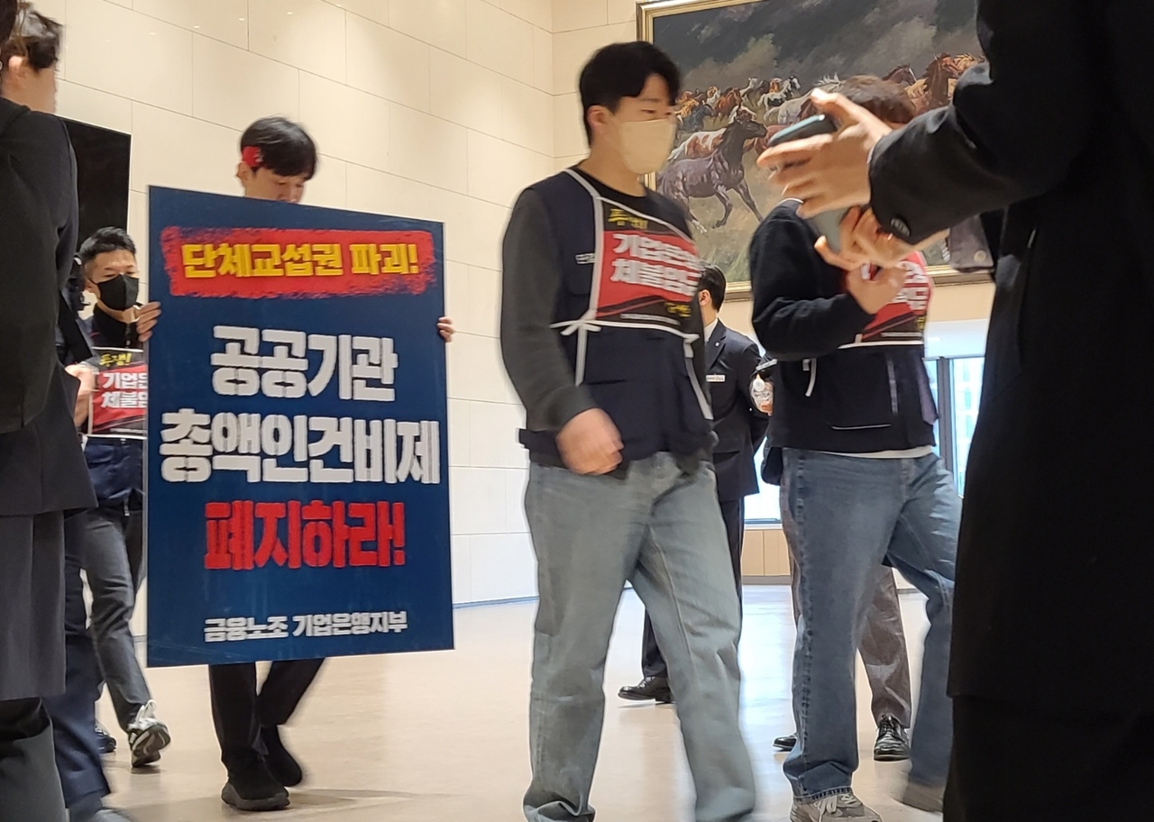 기획재정부가 세수 부족을 국책은행 배당금을 통해 충당한다는 비판이 쏟아지는 가운데, 기업은행 노동자들이 주주총회에 참석해 기획재정부에 과도한 정부 배당 축소와 노동자들에 대한 이익 배분을 요구했다.