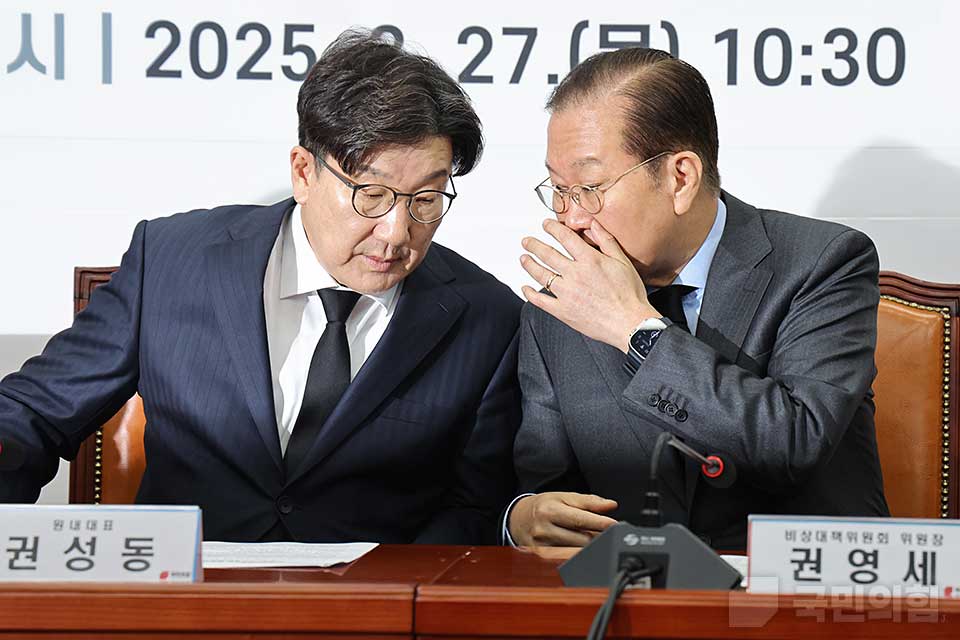 권영세 국민의힘 비상대책위원장은 27일 오전 국회에서 열린 비상대책위원회의에서 “이번 항소심 재판의 모든 쟁점들은 지난 대선에서 유권자의 판단에 막대한 영향을 주었던 중대 사안들이고, 큰 영향을 주지 않았다는 재판부의 판단부터 완전 잘못됐다”며 “사법 시스템에 대한 신뢰는 합리성과 예측 가능성에 토대를 두는데 이 모든 기반을 무너뜨린 것”이라고 목소리를 높였다. 권성동 원내대표는 기자들에게 “우리 비대위 회의 기사를 쓰실 때 저를 클로즈업한 사진은 쓰지 마시라”며 “서울고법에 가면 사진 조작범이 될 수 있다”고 사법부를 조롱했다.