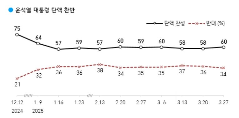 윤 대통령 탄핵에 찬성하는 의견은 60%, 반대는 34%로 나왔다고 28일 밝혔다. 탄핵 찬성 의견은 전주 조사보다 2%포인트 올랐고, 반대 의견은 2%포인트 떨어졌다. 의견 유보는 전주보다 1%포인트 오른 7%를 기록했다.