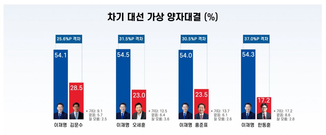 이재명 대표와 여권 잠룡 4명과의 가상 양자 대결에서는 △이재명 54.1%(2.4%P↑) vs 김문수 28.5%(2.2%P↓) △이재명 54.5%(2.7%P↑) vs 오세훈 23.0%(2.7%P↓) △이재명 54.0%(1.7%P↑) vs 홍준표 23.5%(1.5%P↓) △이재명 54.3%(2.5%P↑) vs 한동훈 17.2%(1.3%P↓)으로 나타났다. 2주 전보다 모두 격차가 더 벌어졌다.