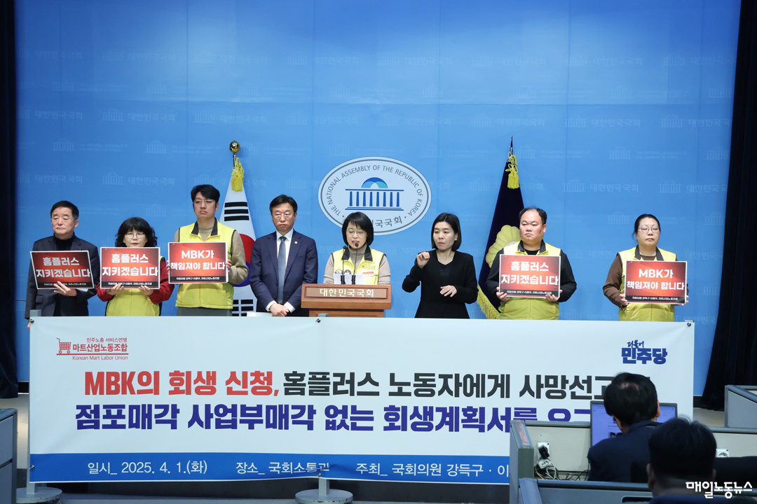 마트노조 홈플러스지부는 1일 오후 국회 소통관에서 홈플러스의 기업회생에 대한 기자회견을 열었다. 노조는 MBK가 사실상 청산을 전제로 회생을 추진하고 있다고 비판하면서 점포매각과 사업부 매각, 구조조정을 배제한 회생계획서를 제출할 것을 요구했다. MBK는 올해 6월12일까지 회생계획서를 제출해야 한다.