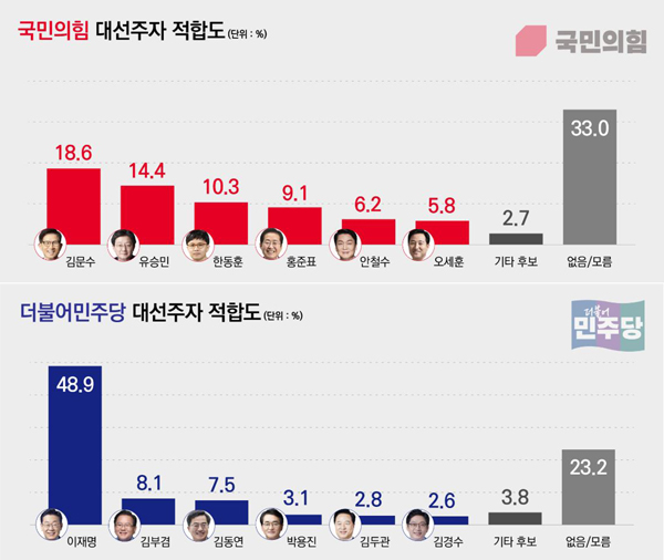여론조사 전문기관 리서치뷰가 KPI뉴스 의뢰로 윤 전 대통령 파면 선고 직후인 지난 4일 오후 전국 만 18세 이상 유권자 1천명을 대상으로 조사한 결과는 민주당 후보 적합도에서 이재명 대표(48.9%), 김부겸 전 총리(8.1%), 김동연 경기지사(7.5%), 박용진 전 의원(3.1%), 김두관 전 의원(2.8%), 김경수 전 경남지사(2.6%) 순이다. 국민의힘 후보 적합도에서는 김문수 장관(18.6%), 유승민 전 의원(14.4%), 한동훈 전 대표(10.3%), 홍준표 시장(9.1%), 안철수 의원(6.2%), 오세훈 시장(5.8%) 순이다.