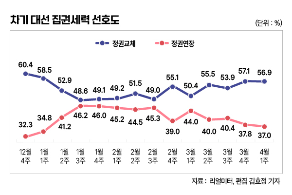 윤석열 전 대통령 파면에 따라 조기대선 국면이 열린 가운데 우리 국민 과반은 차기 대선에서 정권교체가 이뤄져야 한다는 의견을 보였다.
