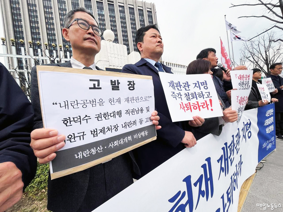 노동·시민사회단체의 항의도 잇따른다. 이날 오전 내란청산·사회대개혁 비상행동(옛 윤석열즉각퇴진·사회대개혁 비상행동)은 서울 종로구 정부서울청사 앞에서 기자회견을 열고 한 권한대행과 이 법제처장을 각각 직권남용권리행사방해죄와 내란죄로 경찰청 국가수사본부에 고발하겠다고 밝혔다. 비상행동은 “한 권한대행은 내란 정부 책임자로 반성과 자중을 해도 모자랄 판에 권한을 남용해 내란세력으로 헌법재판소를 장악하겠다는 것이고, 헌법과 주권자 시민의 의사를 우롱하는 것”이라며 “이 법제처장은 (지난해 12월3일 비상계엄 선포 다음날) 내란세력들과 안가에서 회동한 내란 공범”이라고 지적했다.