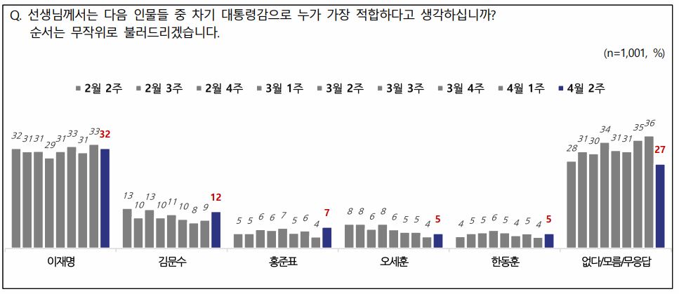 차기 대통령 적합도에서 이재명 전 대표가 32%로 가장 앞섰고, 김문수 전 장관(12%), 홍준표 대구시장(7%), 오세훈 서울시장(5%), 한동훈 전 국민의힘 대표(5%)가 뒤를 따랐다. 전주에 비해 이 전 대표는 1%포인트 하락한 반면, 김 전 장관은 3%포인트, 홍 시장은 3%포인트, 한 전 대표는 1%포인트 각각 상승했다.