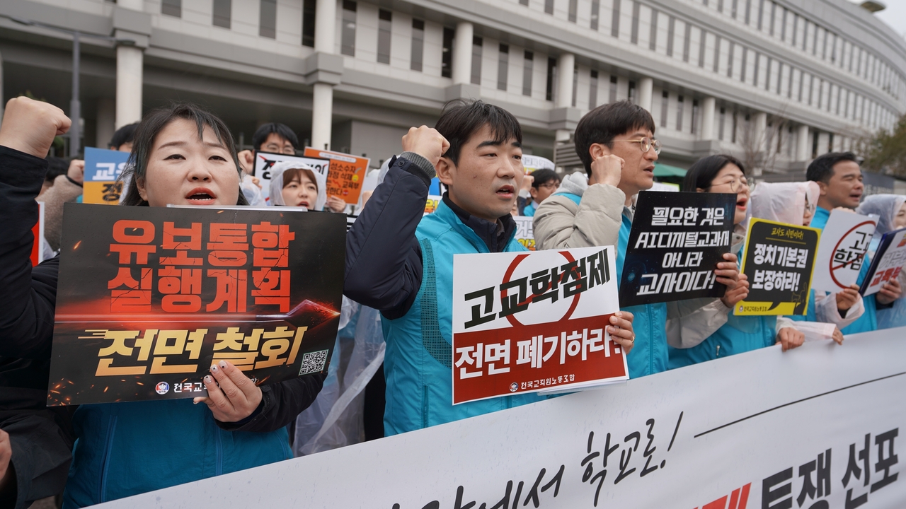 교사들은 윤석열 정부가 국회를 통과한 고교 무상교육과 인공지능(AI) 디지털교과서 교육자료 법안에 거부권(재의요구권)을 행사하고 지난해 기준 고교무상 교육예산 9천437억원을 시·도 교육청에 떠넘겼다고 비판했다. AI 디지털교과서 교육자료 관련 법안은 학교가 교육자료를 자율적으로 선택할 수 있도록 해 AI 디지털교과서 추진을 강행하는 정부에 제동을 건 제도지만, 거부권 행사로 무위에 그쳤다. 노조에 따르면 그럼에도 AI 디지털교과서 선정 학교는 전국 32.4%에 불과했다.