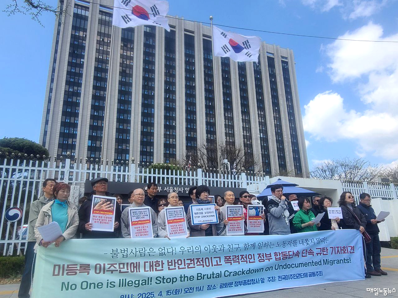 이주노동자평등연대는 15일 오전 서울 광화문 정부서울청사 앞에서 기자회견을 열고 이달부터 실시하는 정부의 미등록 이주민에 대한 합동단속을 비판했다. 이들은 반인권적이고 폭력적인 합동단속으로 이주노동자 사망 사례가 끊이지 않는다고 지적했다.