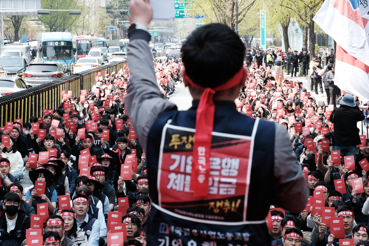 금융노조 기업은행지부(위원장 류장희)는 16일 오전 서울 중구 기업은행 본점 앞에서 임단투 승리 결의대회 및 조직사수 결의대회를 열고 “오늘은 경영진에게 보내는 마지막 경고다”며 “(쇄신안과 관련해) 우리의 요구를 받지 않고 더 건설적인 대안을 제시하지 못한다면 공식적으로 탄핵 절차를 진행하겠다”고 밝혔다. 결의대회에는 조합원 2천여명이 참여했다.
