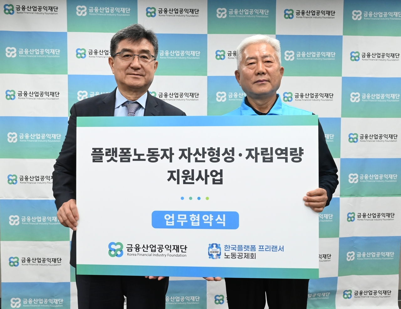 금융산업공익재단과 한국플랫폼프리랜서노동공제회가 지난 21일 서울 중구 재단 회의실에서 ‘플랫폼노동종사자 자산형성·자립역량 지원사업 협약’을 체결했다고 22일 밝혔다.