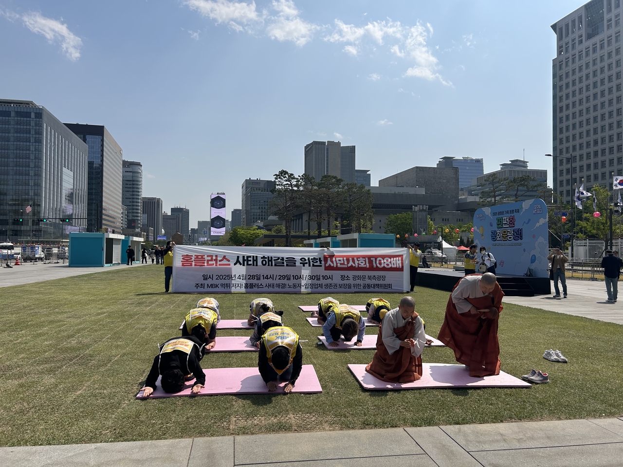 ‘MBK 먹튀 저지! 홈플러스 사태 해결! 노동자·입점업체 생존권 보장을 위한 공동대책위원회’는 28일 오후 서울 종로구 광화문 광장에서 기자회견을 열고 홈플러스 사태 해결 촉구를 위한 108배를 진행했다.