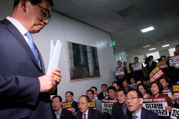 한편 이날 두 상임위 회의에서 국민의힘 의원들은 항의하며 표결에 참여하지 않았다. 권성동 국민의힘 원내대표를 비롯한 국민의힘 지도부는 법사위장과 행안위장 앞에서 각각 규탄대회를 열고 입법 철회와 이 후보 사퇴를 요구했다. 법사위장 앞에서 박형수 국민의힘 원내수석부대표는 “아예 법률로 오늘부터 이재명은 대통령이라고 만들어라”며 “대선에서 이재명 세력을 응징하지 않으면 대한민국은 김정은의 북한보다 더 후진국이 될 것”이라고 언성을 높였다. 규탄대회 소리가 법사위장 안까지 들려와 정청래 법사위장이 “국회 경위들께서 물러가시라고 말씀 좀 부탁드린다”고 여러번 말하기도 했다.