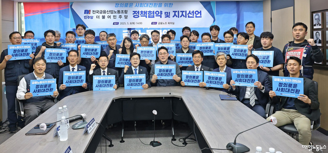 금융노조(위원장 김형선)가 8일 오후 서울 중구 노조 회의실에서 더불어민주당과 금융 공공성 강화를 위한 정책협약을 맺었다.