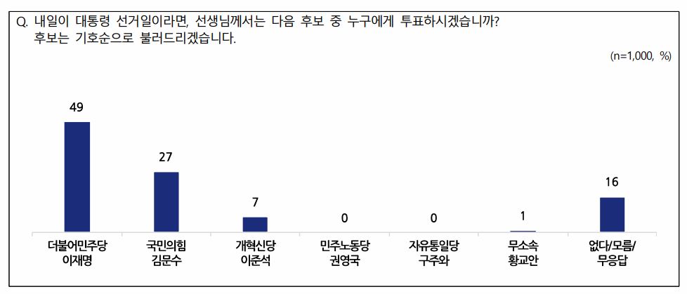 6·3 대선이 20일이 채 남지 않은 가운데 대선후보 지지도가 이재명 더불어민주당 후보(49%), 김문수 국민의힘 후보(27%), 이준석 개혁신당 후보(7%), 권영국 민주노동당 후보(0%) 순으로 나타났다.