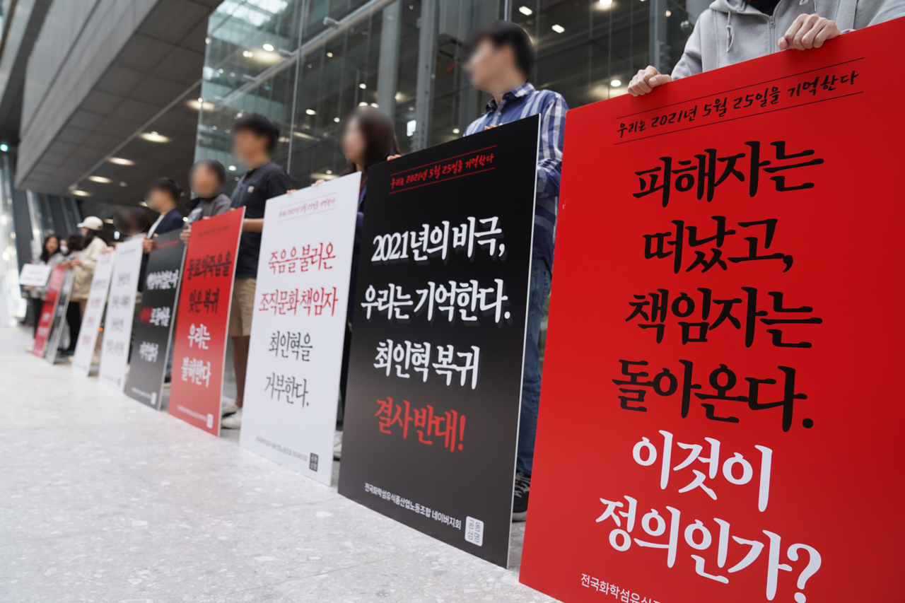 시위는 오전 8시30분부터 10시까지 출근시간대에 진행했다. 조합원 60명이 참여해 ‘피해자는 떠났고, 책임자는 돌아온다 이것이 정의인가’ ‘2021년의 비극 우리는 기억한다 최인혁 복귀 결사반대’ ‘죽음을 불러온 조직문화 책임자 최인혁을 거부한다’ 같은 문구를 적은 피켓을 들었다.