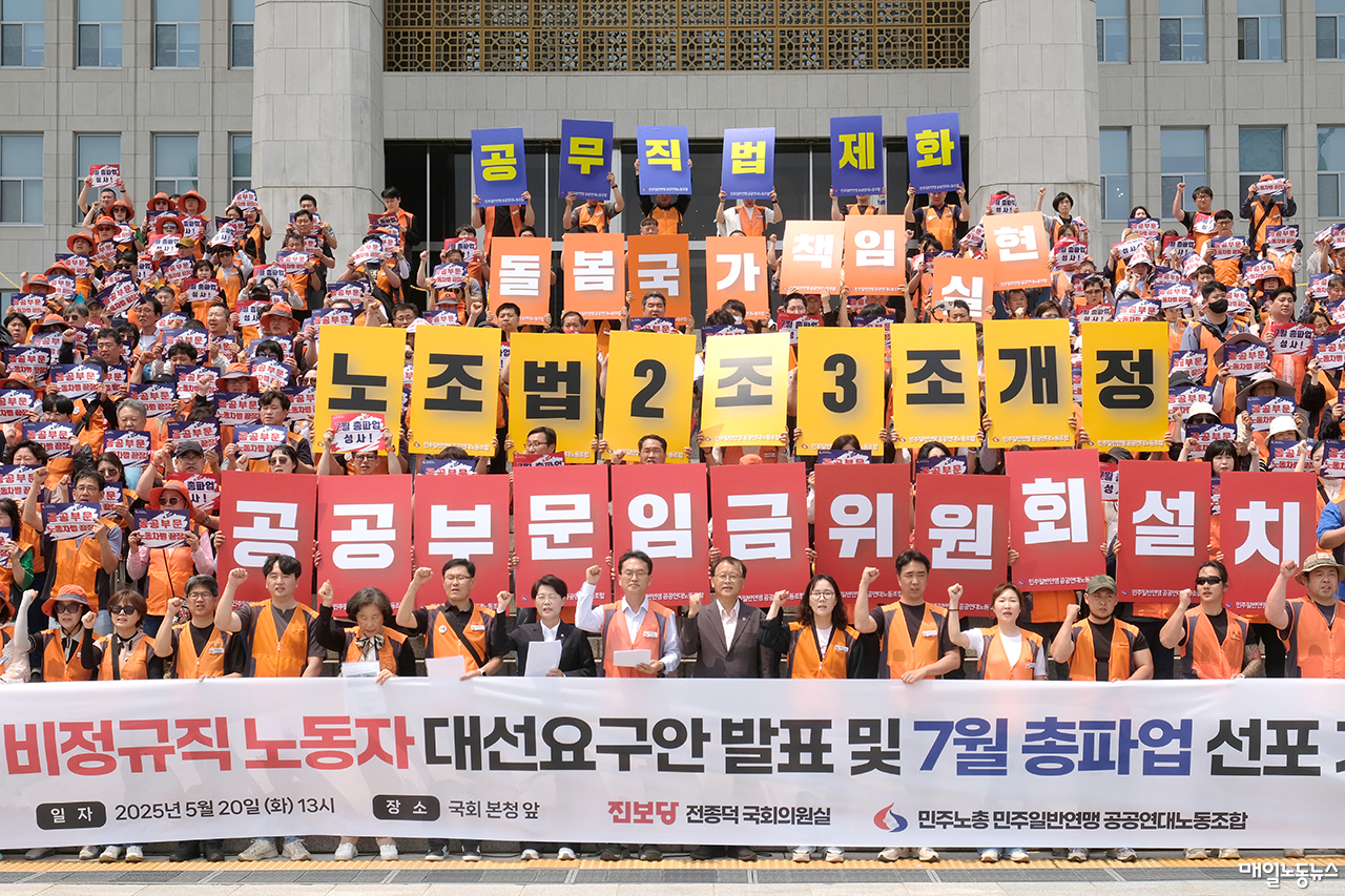 노조는 “윤석열이 광장의 힘으로 물러났고, 공공부문 비정규직 노동자들도 대선 이후 새로운 사회를 꿈꿔본다”며 “우리는 대선요구안 실현을 위해 민주노총과 함께 7월 총파업에 전 조합원이 적극 나설 것을 선포하고 결의한다”고 강조했다.