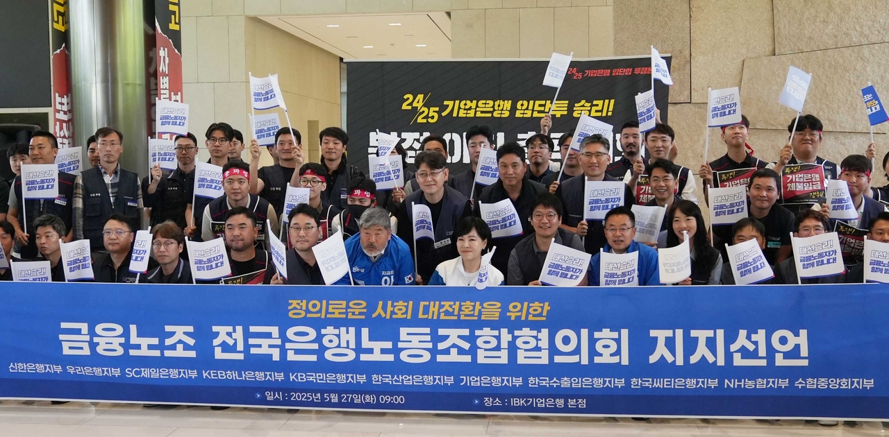 금융노조 1금융권 지부가 모인 전국은행노조협의회가 27일 오전 서울 중구 기업은행 로비에서 이재명 더불어민주당 대선후보 지지를 선언했다. 민주당은 노조협의회에 속해 있는 기업은행지부 현안 해결을 재차 약속했다.