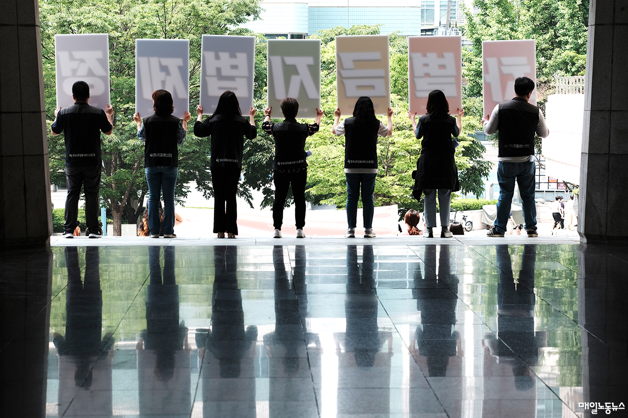 물감 묻힌 종이를 반으로 접어서 문질러 표현하는 방식이다. 어린 시절 미술시간에 한 번씩 해봤을 테다. 파란색, 빨간색만으로는 밋밋했다. 노란색만도 그렇다. 빨주노초파남보 물감 아낌없이 짜내어 가지각색 무지개를 찍는 아이들이 많았다. 알록달록 번지고 섞인 색상들이 참 예뻤던 기억이 있다. 사진에서도 흔히 쓰는 표현 방식이다. 해질녘 호숫가에 비친 산과 나무는 풍경 사진의 단골 소재였다. 대칭이 만들어내는 시각적 아름다움이 집중도를 높인다고 한다. 종종 붉은 머리띠 맨 노동자들이 눈 녹은 물 고인 웅덩이를 오체투지로 지나는 장면을 찍을 일이 있었다. 치열한 싸움 장면에서도 보기 좋은 아름다움을 담아내려는 건 사진의 쓰린 숙명이다. 대선 막바지, 거친 말들이 칼처럼 날아 치열한 싸움이 한창이다. 끝 간 데 없이 치졸한 공격이 이어져 지켜보던 시민들은 참담했다. 선거의 쓰린 숙명이라기엔 혐오가, 상처가 깊다. 저기 성평등 노동 실현 목소리 내려 길에 선 노동자들이 대통령 후보자의 막말 만행을 규탄했다. 한편 ‘대학 못 간 여성’ ‘찐 노동자’를 향한 어느 엘리트 작가의 말에 사람들이 오늘 또 아팠다. 차별과 멸시, 비하는 과연 선 자리를 가리지 않았다. 데칼코마니 양쪽처럼, 똑같지는 않아도 많이 닮아 있다. 차별금지 팻말 든 저들이 광장에서 죄도 없이 벌쓰는 일이 잦을 전망이다.