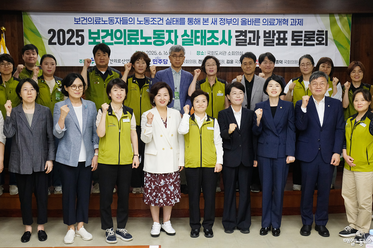 보건의료노조는 16일 오후 국회도서관에서 2025 보건의료노동자 실태조사 결과 발표 토론회를 열고 이 같은 조사 결과를 발표했다. 이날 토론회는 이수진·전진숙·김윤 더불어민주당 의원과 전종덕 진보당 의원이 함께 주최했다. 고려대 노동문제연구소가 노조에 위탁받아 지난 1월6일부터 1월24일까지 보건의료노동자 4만4천903명을 대상으로 조사를 실시했다. 임금·노동조건·조직운영·갑질·인력현황 등 보건의료현장에서 살펴야 할 7개 영역에 대한 조사가 이뤄졌다.