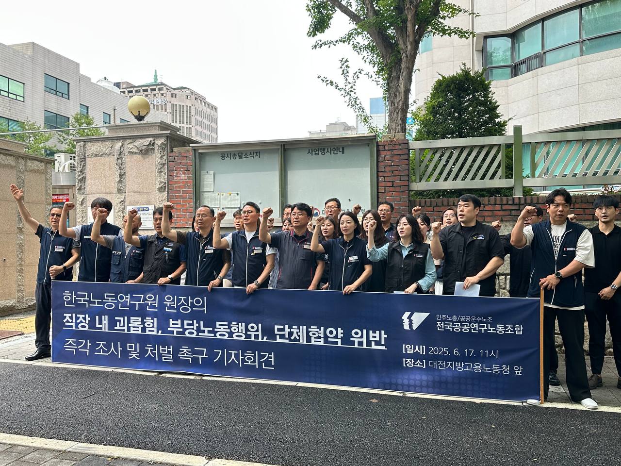 공공연구노조 한국노동연구원지부(지부장 윤미례)는 17일 오전 대전 서구 대전지방고용노동청 앞에서 기자회견을 열고 “한국노동연구원장은 반노동 행위를 즉각 중단하라”고 요구했다. 지부는 이날 기자회견이 끝난 뒤 대전노동청에 허 원장을 처벌해 달라는 내용의 진정서를 전달했다. 허 원장이 직장내 괴롭힘을 저질러 근로기준법을 위반했고, 부당노동행위와 단협 위반으로 노동조합 및 노동관계조정법(노조법)을 어겼다는 취지다.