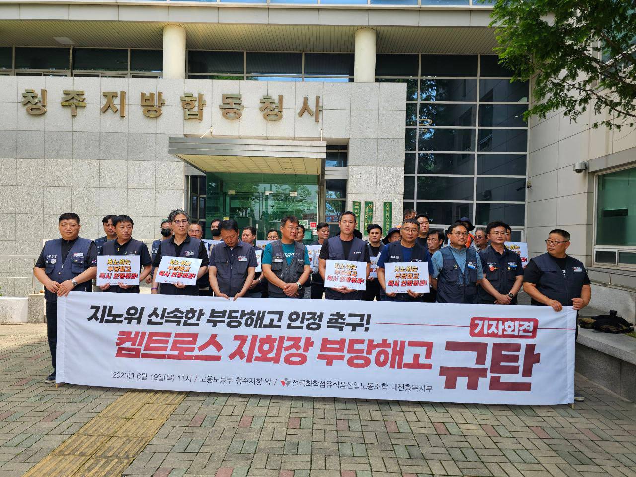 화섬식품노조 켐트로스지회(지회장 김응렬)는 19일 오전 고용노동부 청주지청 앞에서 기자회견을 열고 “노동위원회는 지금 즉시 부당노동행위와 부당해고를 자행하는 사용자쪽에 신속하고 엄정한 판정을 내려야 한다”고 밝혔다.