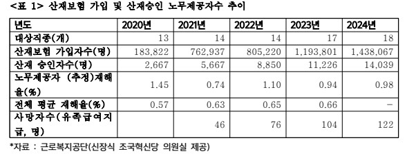 여전히 한계가 있지만, 한국의 산재보험 영역은 점차 확대되고 있다. 노무제공자들의 산재보험 적용을 확대해 왔지만, 2020년까지는 가입자수가 13개 직종 18만여명에 불과했다. 2021년 노무제공자의 산재보험 임의가입 요건을 강화하면서 가입자수가 76만여명으로 대폭 증가했고, 2023년 전속성 요건 폐지로 산재보험 가입 노무제공자수가 120만명에 육박하였으며, 2024년에는 144만여명이 산재보험제도로 편입되었다.