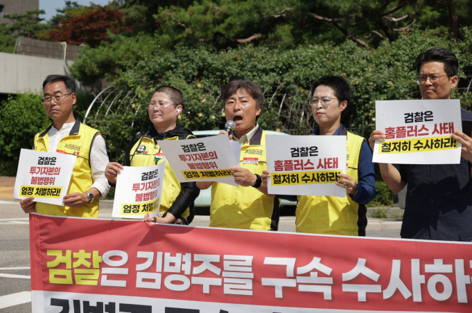 홈플러스 사태 해결 공동대책위원회와 홈플러스 유동화전단채 피해자 비상대책위원회는 23일 오전 서울 서초구 서울중앙지검 앞에서 기자회견을 열고 김 회장에 대한 검찰 수사가 지지부진하다고 비판했다.