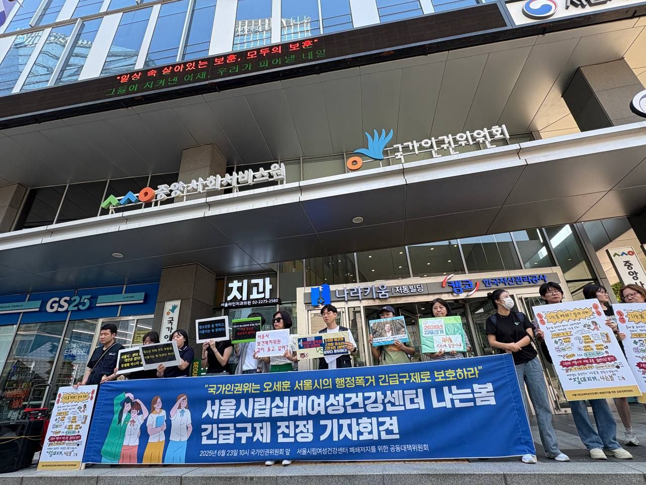 ‘서울시립십대여성건강센터 나는봄 폐쇄저지를 위한 공동대책위원회’는 23일 오전 서울 중구 국가인권위 앞에서 기자회견을 열었다. 공동대책위에는 공공운수노조 사회복지지부·민주노총 서울본부 등이 포함돼 있다.