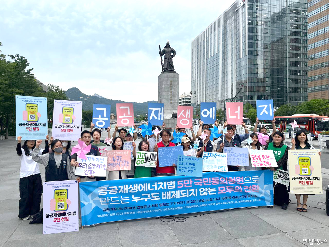 양대 노총과 노동당·녹색당·민주노동당·진보당, 기후위기비상행동·기후정의동맹·공공재생에너지연대·전국민중행동은 24일 오전 서울 종로구 광화문 광장에서 기자회견을 열고 공공재생에너지법 제정을 촉구했다. 단체들은 이날부터 한 달 동안 공공재생에너지법 입법을 요구하는 내용의 국민동의청원을 성사하기 위해 힘을 모으겠다고 강조했다. 시민 100명이 청원에 찬성해 청원요건은 충족됐고 국회사무처 검토가 끝나는 대로 5만명 동의절차가 시작한다.