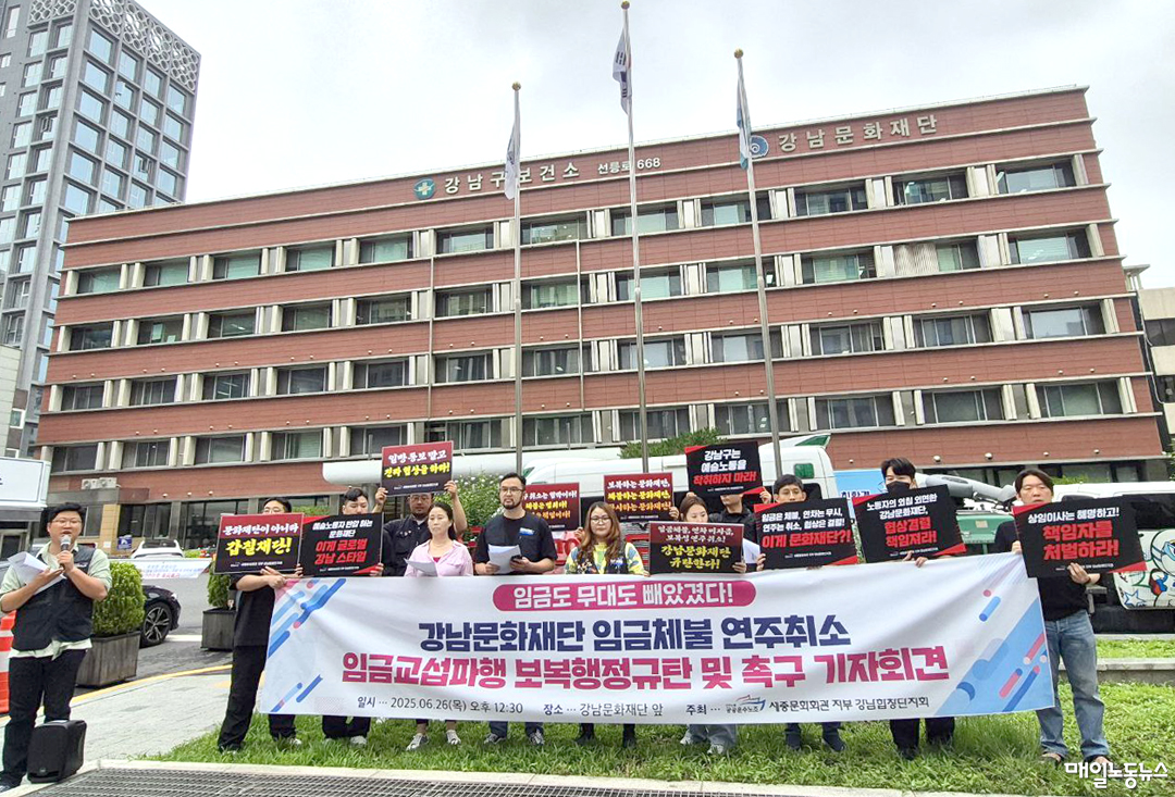 지회는 이날 오후 강남문화재단 앞에서 기자회견을 열고 “강남문화재단이 공연을 일방적으로 취소하며 보복성 행정을 지속하고 있다”고 규탄했다. 박해찬 지회장은 “재단이 정말로 문화와 예술을 존중한다면 예술노동자의 노동권과 생존권을 보장해야 한다”며 “연주를 일방적으로 취소하거나 축소하는 예술노동자에 대한 탄압을 중단하라”고 말했다.