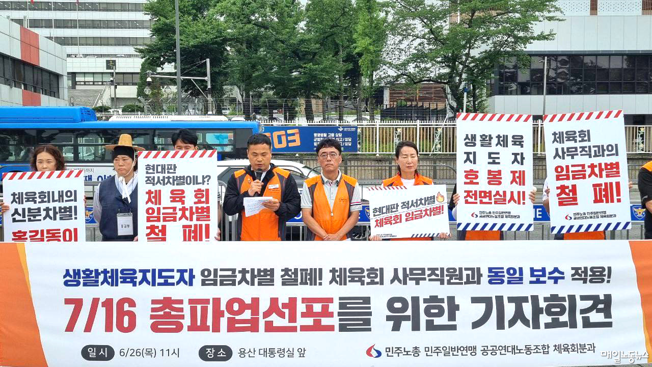 공공연대노조는 26일 오전 서울 용산구 대통령실 인근에서 기자회견을 열고 생활체육지도자가 지방자치단체 산하 체육회 사무국 직원들과 비교해 임금차별과 직장내 괴롭힘 등 부당한 대우를 받고 있다고 주장했다.