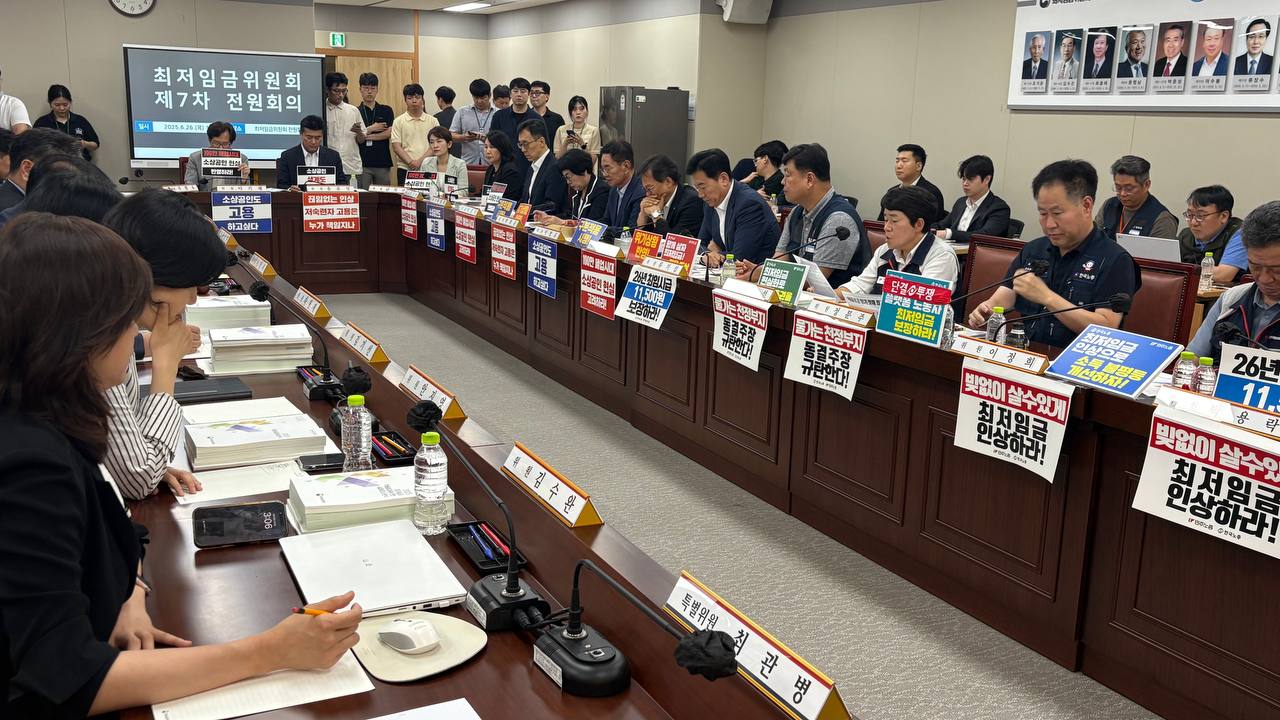 최저임금위원회(위원장 이인재)는 26일 오후 정부세종청사에서 7차 전원회의를 열었다. 내년 최저임금의 수준을 놓고 논의한 것은 이날이 처음이다. 2026년 최저임금 결정을 위한 법정 심의기한인 29일 전 열리는 마지막 회의이기도 하다. 다음달 1일 열리는 8차 전원회의에서 격론을 이어 갈 전망이다.